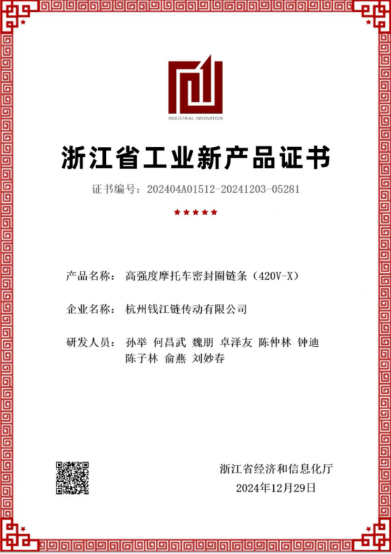 Model Rantaian Tertutup Minyak Motosikal Berkekuatan Tinggi 420V-O(X) Dibangunkan dan Dihasilkan oleh Hangzhou Qianjiang Chain Industries Co., Ltd. Lulus Pensijilan Produk Baharu Peringkat Wilayah